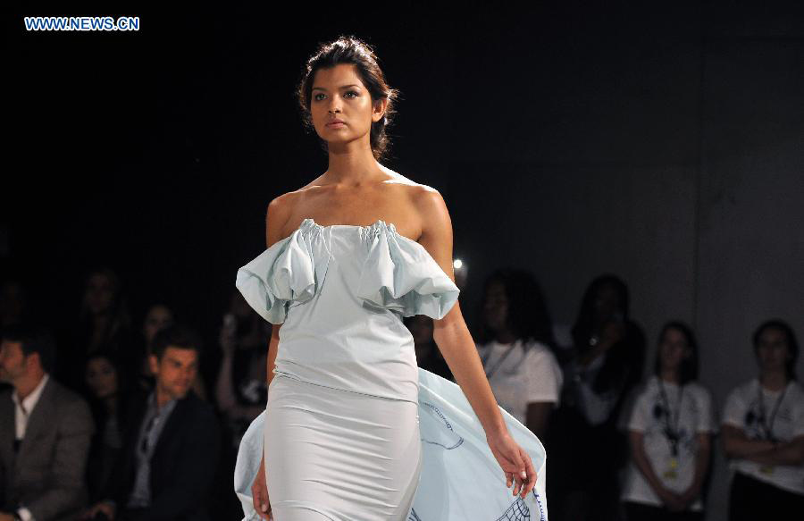 A model presents a creation of the Spring/Summer 2015 SUPIMA collection during the New York Fashion Week in New York, the United States, Sept. 4, 2014. (Xinhua/Wang Lei)