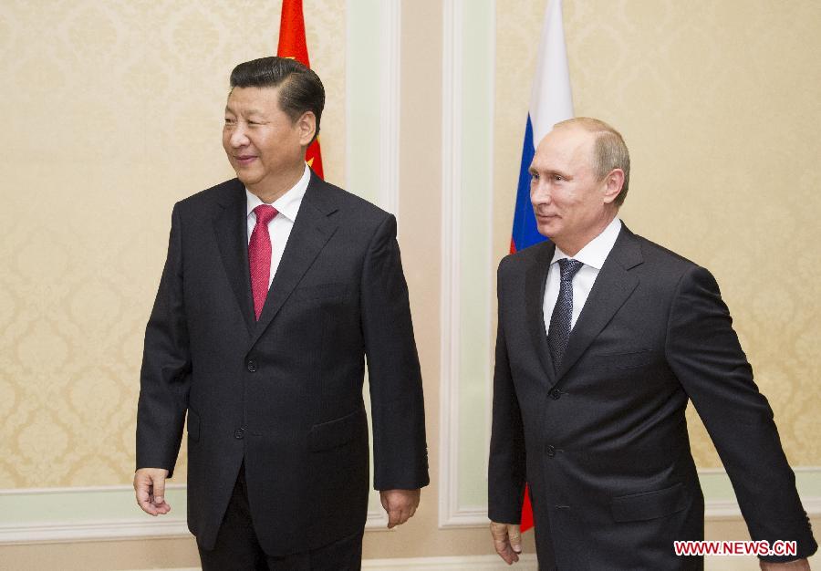 | Chinese President Xi Jinping (L) meets with his Russian counterpart Vladimir Putin in Dushanbe, capital of Tajikistan, Sept. 11, 2014. (Xinhua/Huang Jingwen) |