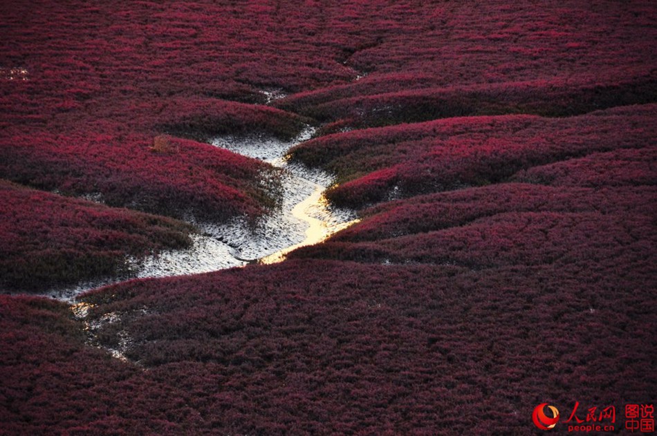 Suaeda glauca is the main plant in this area. It starts to grow in April every year and turns from light red to dark red then to purple in September. (Photo/People's Daily Online)