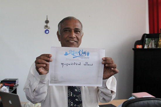 Abeysekera writes "Hello China" in Sinhalese.(People's Daily Online/Li Luying)