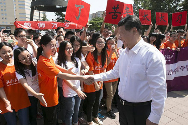 | President Xi Jinping warmly shakes hands with people in Beijing Normal University. (Xinhua/Pang Xinglei) |