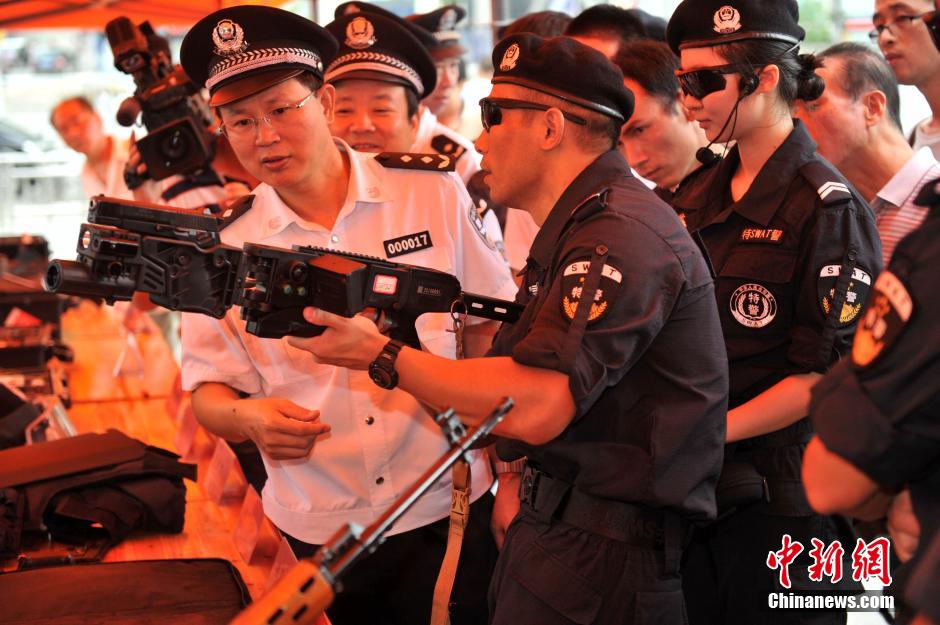 Anti-terror devices exhibition is held in Fuzhou, southeast China's Fujian province on Sept. 11, 2014. Around 20 thousand Defense of terrorism attack handbooks are delivered to local residents on the exhibition. Combining words with cartoons, this handbook aims to introduce basic knowledge of anti-terrorism, defense of terrorism attacks, how to avoid attacks and how to save their lives.