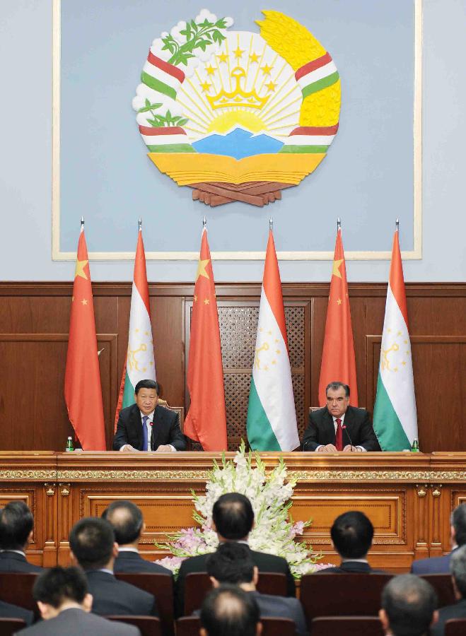 Chinese President Xi Jinping (L) and Tajik President Emomali Rahmon attend a press conference in Dushanbe, capital of Tajikistan, Sept. 13, 2014.(Xinhua/Xie Huanchi)