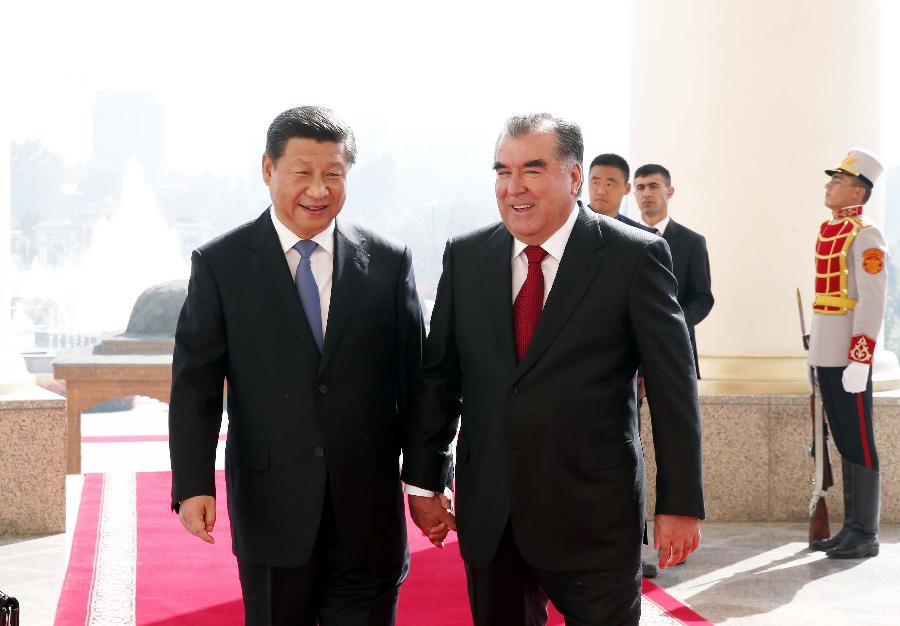 Chinese President Xi Jinping (L front) and Tajik President Emomali Rahmon (R front) walk into a hall before their talks in Dushanbe, capital of Tajikistan, Sept. 13, 2014.(Xinhua/Ju Peng)
