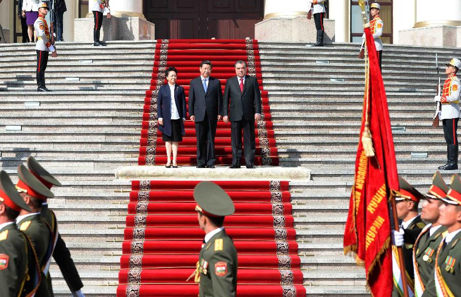 Chinese President Xi Jinping (C) attends a welcoming ceremony held by Tajik President Emomali Rahmon in Dushanbe, capital of Tajikistan, Sept. 13, 2014.(Xinhua/Ma Zhancheng)