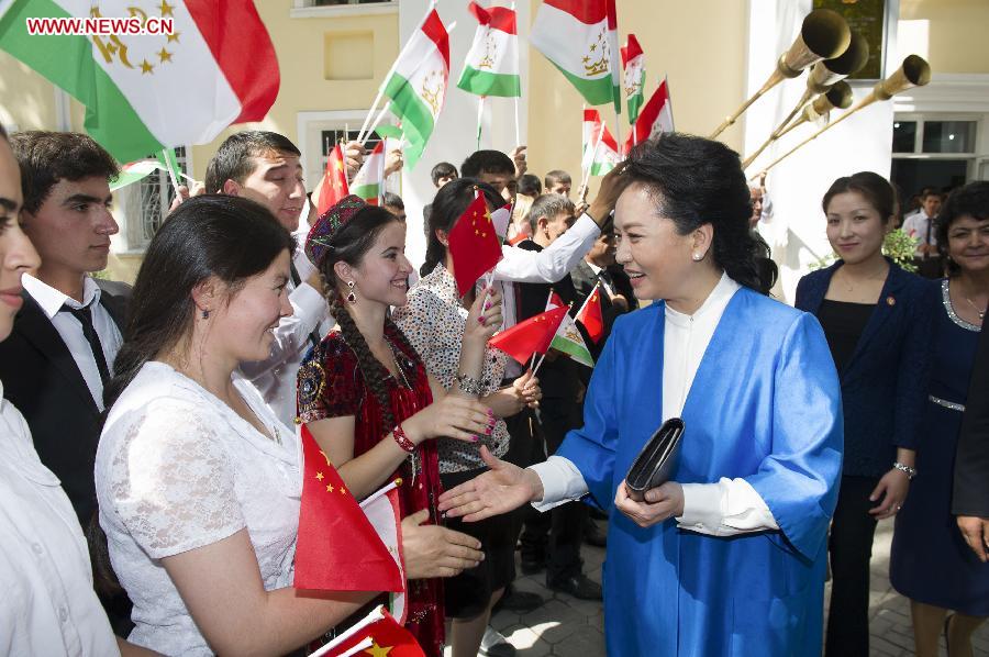 China's first lady Peng Liyuan visits Tajikistan state college of music arts in Dushanbe (2)