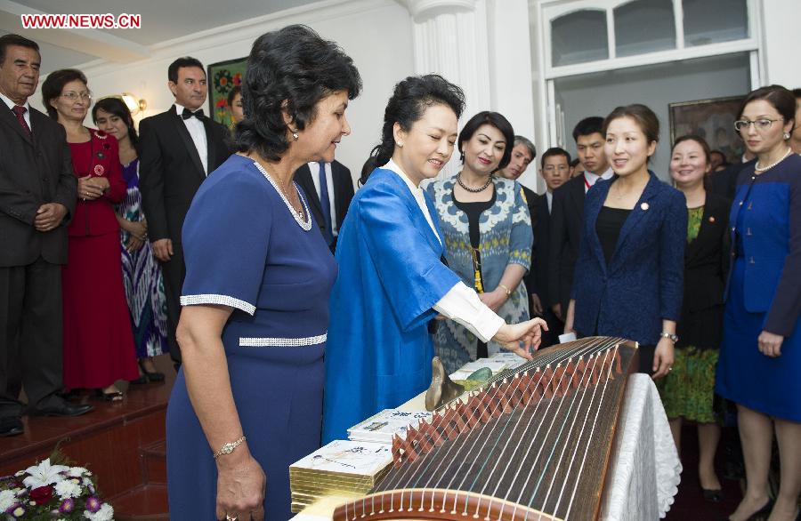 Chinese President Xi Jinping's wife Peng Liyuan donates a traditional Chinese musical instrument to Tajikistan state college of music arts in Dushanbe, capital of Tajikistan, Sept. 12, 2014. (Xinhua/Huang Jingwen)