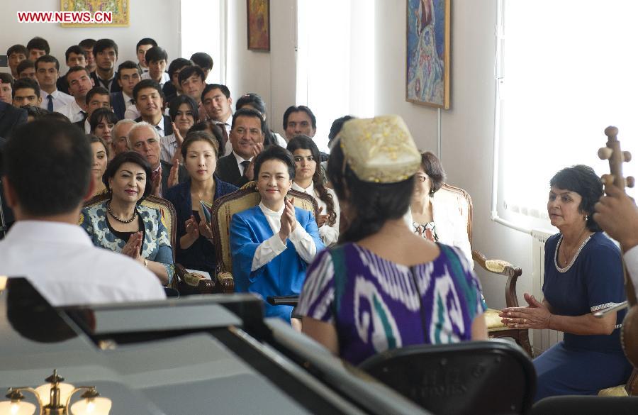 | Chinese President Xi Jinping's wife Peng Liyuan watches performance of teachers and students at Tajikistan state college of music arts in Dushanbe, capital of Tajikistan, Sept. 12, 2014. (Xinhua/Huang Jingwen) |
