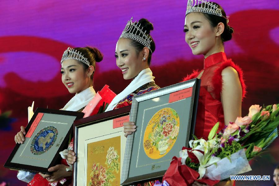 Winner Wang Yunting (C), runner-up Jia Jiawen (R) and second runner-up Wang Ying pose for photos during the awarding ceremony of the 9th Miss China Pageant final in Zhangbei County, north China's Hebei Province, Sept. 13, 2014. (Xinhua/Li Mingfang)