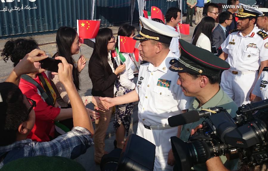 | The Chinese escort fleet commander Huang Xinjian (C) is welcomed by overseas Chinese in Abu Dhabi, United Arab Emirates, Sept. 14, 2014. The 17th Chinese escort naval fleet, which has just finished its mission in the Gulf of Aden and Somali waters, arrived at Abu Dhabi for a five-day visit. (Xinhua/An Jiang) |