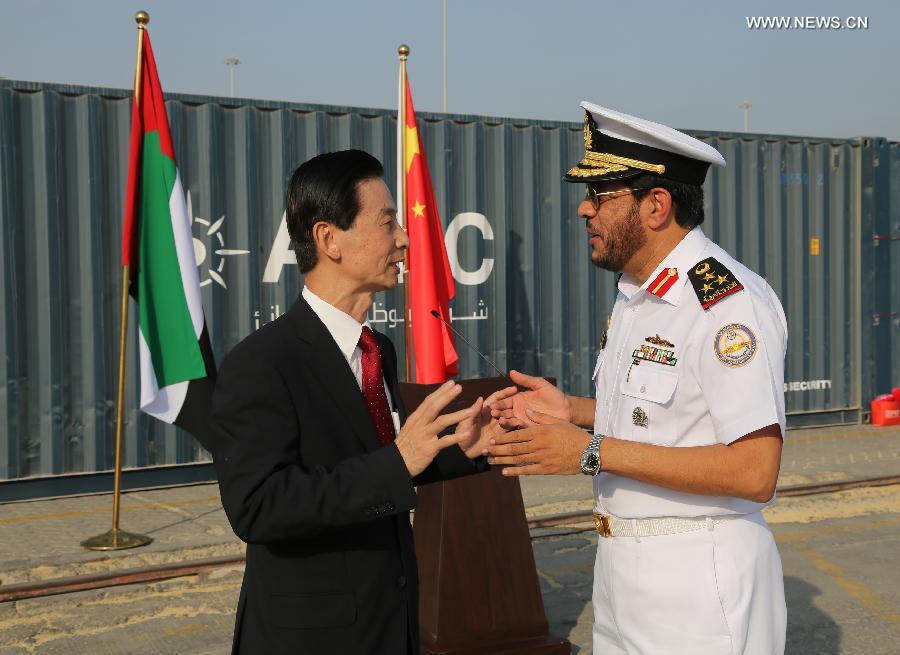 Chinese ambassador to UAE Huang Jiemin (L) and an UAE navy commandore talk to each other upon the arrival of the visiting Chinese fleet in Abu Dhabi, United Arab Emirates, Sept. 14, 2014. The 17th Chinese escort naval fleet, which has just finished its mission in the Gulf of Aden and Somali waters, arrived at Abu Dhabi for a five-day visit. (Xinhua/An Jiang)