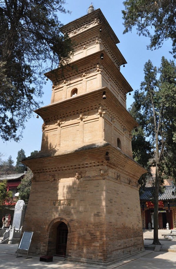 Facing south, Xingjiao Temple Pagoda is square when viewed from above and is a five-level attic-styled brick structure. It is about 21 meters tall and each side of the ground level is 5.2 meters long. Inside the niche on the south side of the ground level is a clay statue of Xuanzang, while a stone inscription titled "Inscription in Honor of Master Tang Sanzang also known as the Dabianjue Master," created in the 4th year of the Kaicheng period of the Tang Dynasty (839 AD), is on the northern wall. The inscription carries a description of how Xuanzang was born, became a Buddhist monk, was initiated into monkhood, went on his famous pilgrimage for Buddhist scriptures, and translated the Buddhist scriptures.