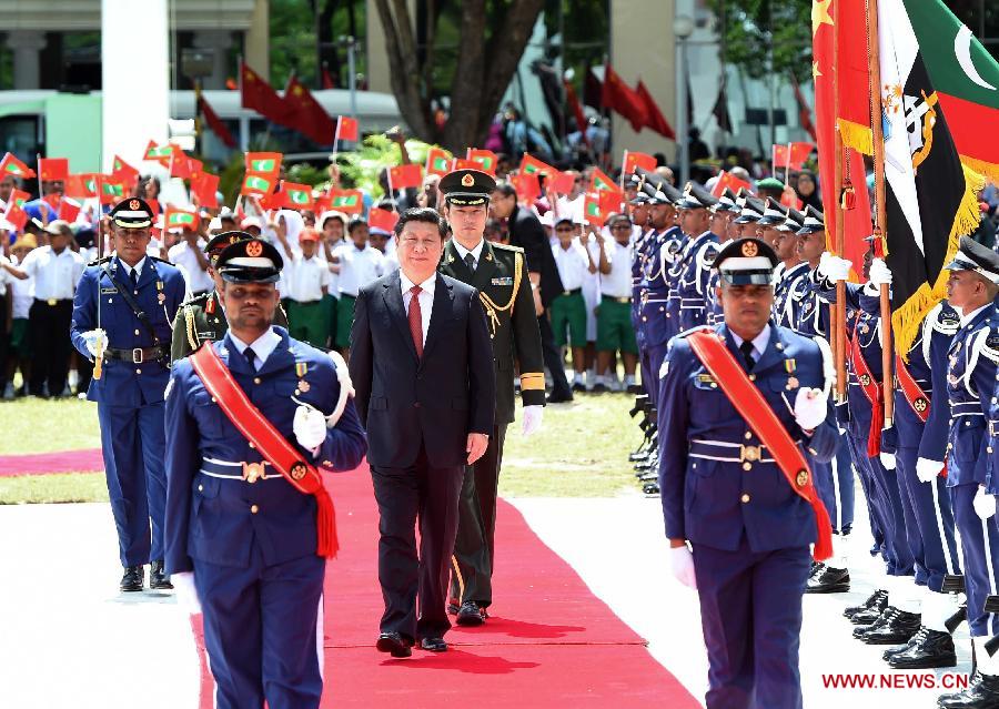 Maldivian President Abdulla Yameen Abdul Gayoom holds a welcome ceremony for Chinese President Xi Jinping before their talks in Male, Maldives, Sept. 15, 2014. (Xinhua/Ma Zhancheng)