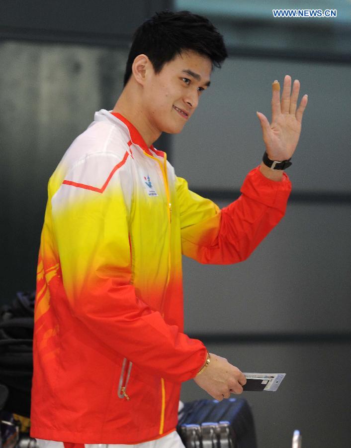 Chinese swimming athlete Sun Yang walks out of the international airport in Incheon, South Korea, Sept. 16, 2014. Some members of the Chinese Sports Delegation arrived in Incheon on Tuesday afternoon to attend the 17th Asian Games. (Xinhua/Gong Lei)