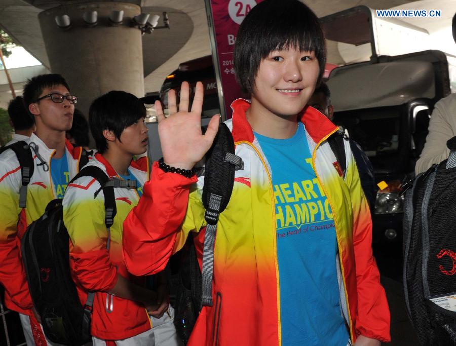 Chinese swimming athlete Ye Shiwen (front) walks out of the international airport in Incheon, South Korea, Sept. 16, 2014. Some members of the Chinese Sports Delegation arrived in Incheon on Tuesday afternoon to attend the 17th Asian Games. (Xinhua/Gong Lei)