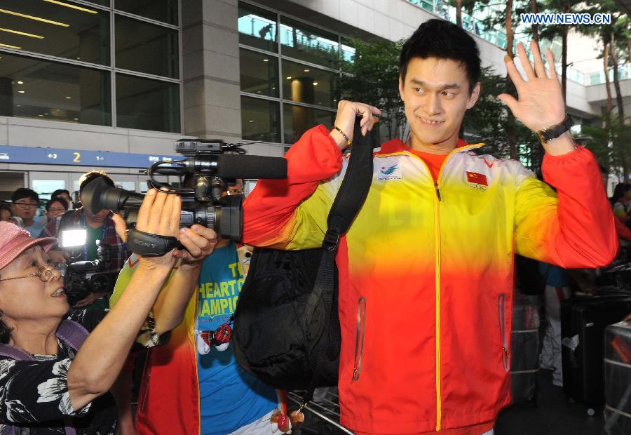 Chinese swimming athlete Sun Yang (R) walks out of the international airport in Incheon, South Korea, Sept. 16, 2014. Some members of the Chinese Sports Delegation arrived in Incheon on Tuesday afternoon to attend the 17th Asian Games. (Xinhua/Gong Lei)