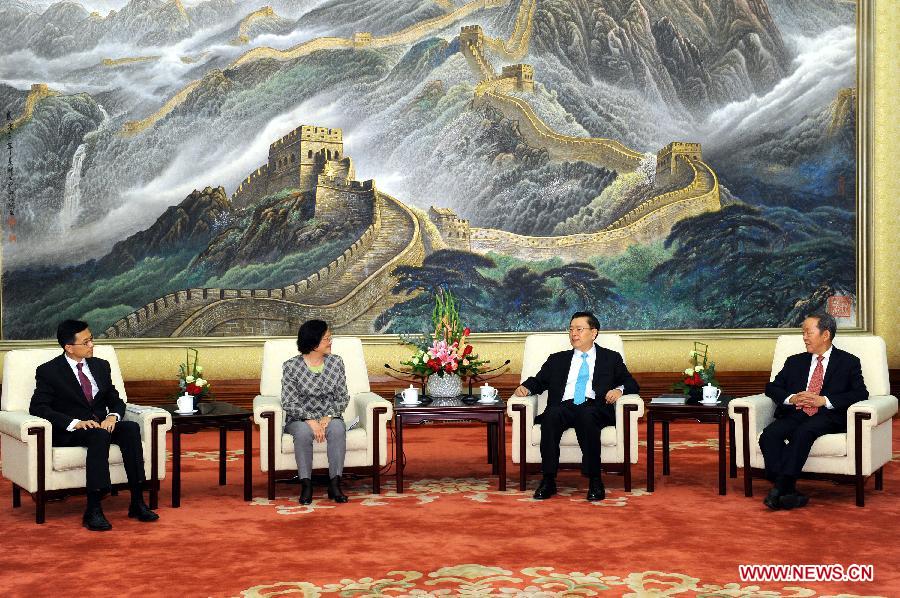| Zhang Dejiang (2nd R), chairman of the Standing Committee of China's National People's Congress (NPC), meets with members of a visiting delegation of the Hong Kong Federation of Trade Unions headed by its president Lam Shuk-yee (2nd L). (Xinhua/Rao Aimin) |
