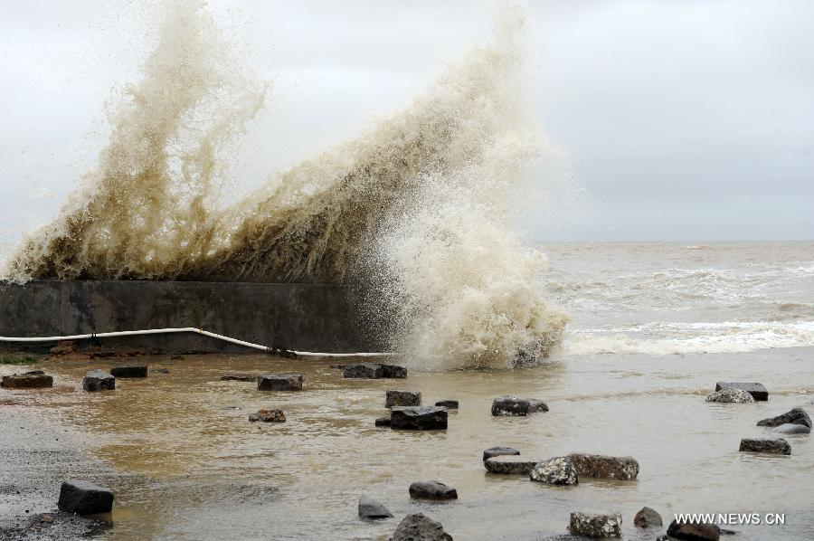 Huge waves are seen on the seashore in typhoon-hit Xuwen County of Zhanjiang City, south China's Guangdong Province, Sept. 16, 2014. Typhoon Kalmaegi landed in the coastal areas of Xuwen County on Tuesday noon. (Xinhua/Liang Xu)