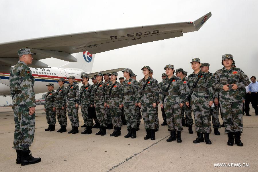 Members of a Chinese laboratory team line up before departing for Sierra Leone to help West African countries to contain the Ebola epidemic, in Beijing, capital of China, Sept. 16, 2014. The 59-member team, based at the Sierra Leone-China Friendship Hospital in the outskirts of the capital, Freetown, will carry out lab screening and observation to help Sierra Leone to improve lab testing. (Xinhua/Jin Liangkuai)