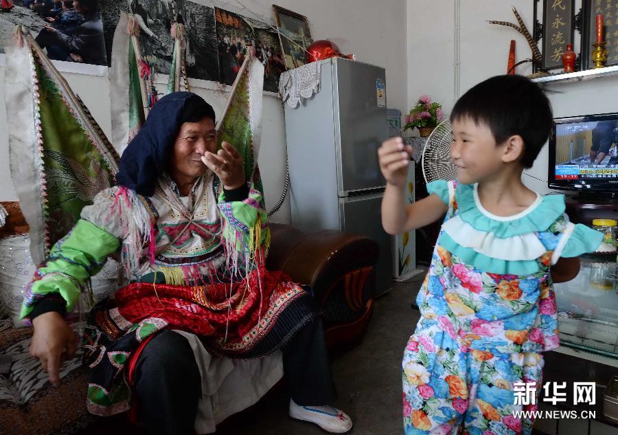 Zhan Xueyan (L), a national-level successor, teaches his granddaughter to perform in Anshun, southwest China's Anhui province. (Xinhua/Lu Wei)