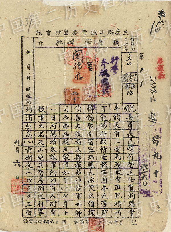 Zhang Fakui and Lu Han gave an account of the military movements of Japanese army in the telegrams to the office of the chairman of Military Affairs Commission from August 17 to September 9, 1945. (Photo/Second Historical Archives of China)