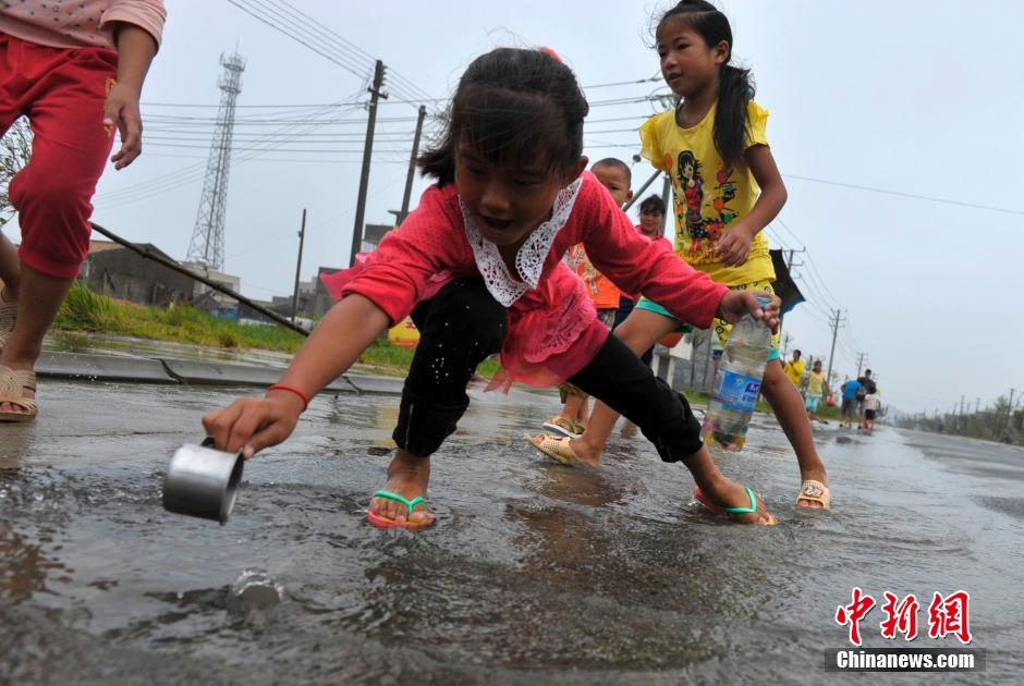Children catch fish on the street in Wenchang, south China’s Hainan province on Sept. 16, 2014. (Photo/Chinanews.com)