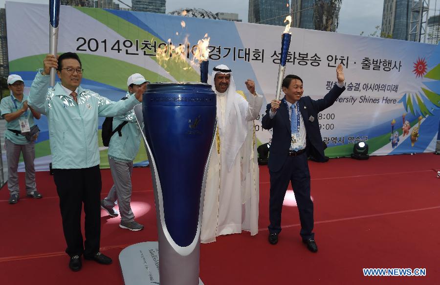 President of Olympic Council of Asia Ahmad Al-Fahad Al-Sabah (C), secretary-general of Incheon Asian Games Organizing Committee (IAGOC) Kwon Kyung-sang (R) and Yeonsu district chief Lee-Jaeho light a based torch during the Incheon Asian Games Torch Relay in Incheon, South Korea, Sept. 17, 2014. The 17th Asian Games will be held from Sept. 19 to Oct. 4. (Xinhua/Ye Pingfan)