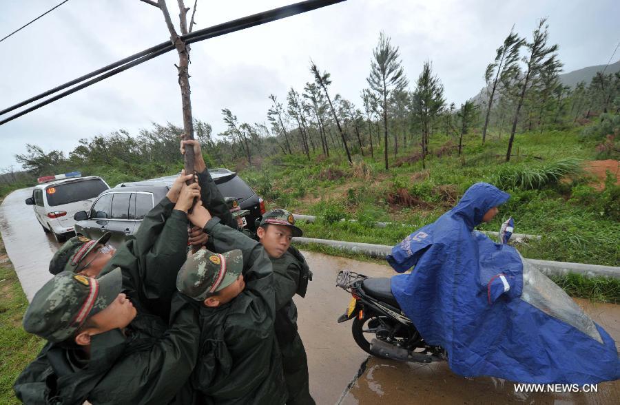 Soldiers clear a road in Wengtian Town of Wenchang City, south China's Hainan Province, Sept. 16, 2014. The Typhoon Kalmaegi made landfall in Wengtian at a speed of 40 meters per second at 9:40 a.m. It is the fifteenth typhoon to hit China this year. (Xinhua/Zhao Yingquan)