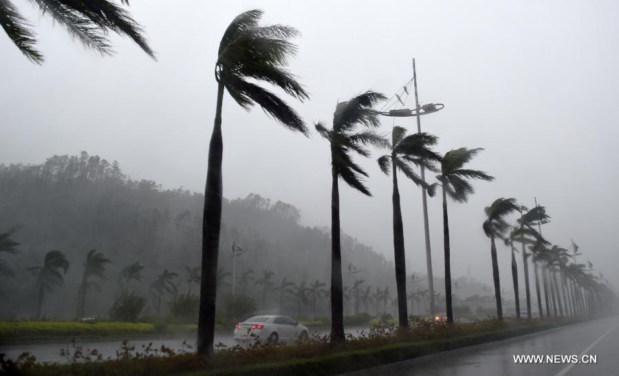 Vehicles move against wind and rain in Fangchenggang City, south China's Guangxi Zhuang Autonomous Region, Sept. 16, 2014. The fifteenth Typhoon Kalmaegi hit Guangxi on Tuesday, affecting about 294,700 local residents and forcing the relocation of 25,800 people. (Xinhua/Lu Boan)