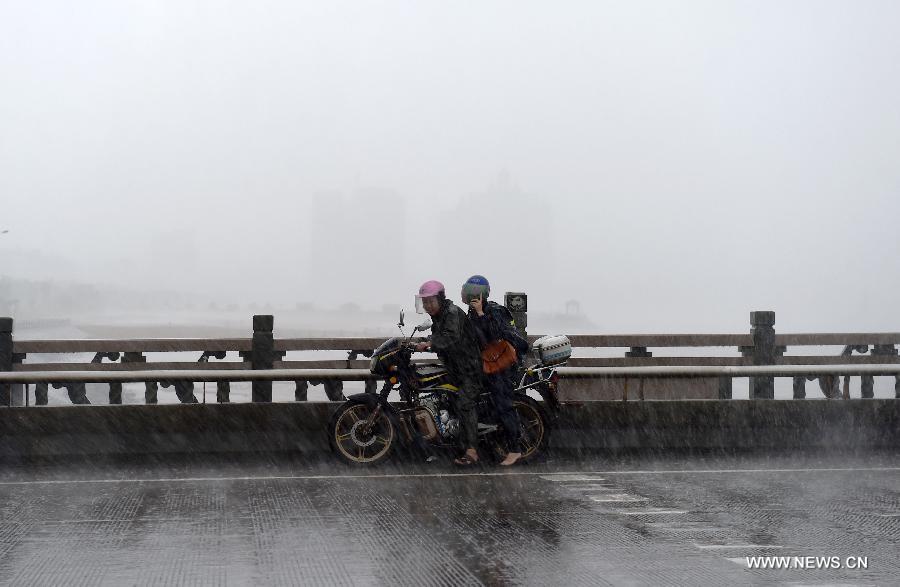 People ride a motorcycle against rain in Fangchenggang City, south China's Guangxi Zhuang Autonomous Region, Sept. 16, 2014. The fifteenth Typhoon Kalmaegi hit Guangxi on Tuesday, affecting about 294,700 local residents and forcing the relocation of 25,800 people. (Xinhua/Lu Boan)