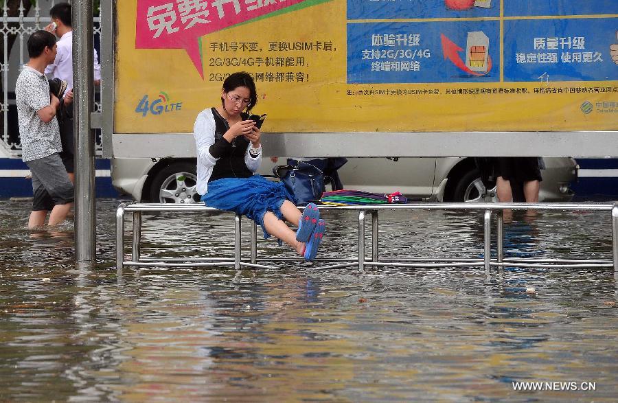 A woman rests at a flooded bus station in typhoon-hit Haikou City, capital of south China's Hainan Province, Sept. 16, 2014. Seawater flew backward into the city as typhoon Kalmaegi landed in the island province on Tuesday morning. (Xinhua/Guo Cheng)