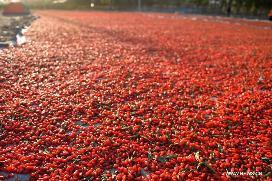 Farmers dry Chinese wolfberry in Dulan County of northwest China's Qinghai Province, Sept. 16, 2014. The output of Chinese woldberry in Dulan County reached 30,000 tons in 2014, with the production value of 900 million RMB yuan (145.8 million U.S. dollars). (Xinhua/Liu Dongjun)