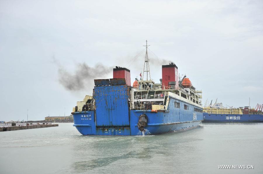 Vehicles wait to board a ship at the Haikou Port in Haikou, capital of south China's Hainan Province, Sept. 17, 2014. Shipping on the Qiongzhou Strait has been resumed one day after typhoon Kalmaegi landed in the island province on Tuesday morning. (Xinhua/He Zhicheng)