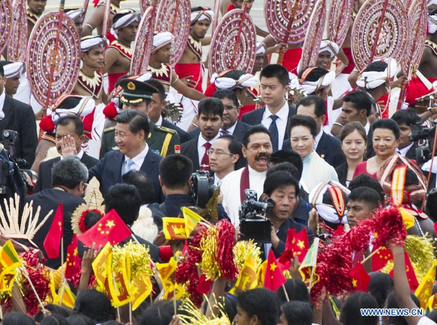 Chinese President Xi Jinping and his wife Peng Liyuan are welcomed by Sri Lankan President Mahinda Rajapaksa upon their arrival in Colombo, Sri Lanka, Sept. 16, 2014. Xi Jinping arrived here Tuesday for a state visit to Sri Lanka. (Xinhua/Huang Jingwen)