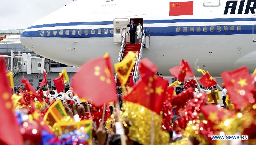 Chinese President Xi Jinping (L) and his wife Peng Liyuan wave to the crowd upon their arrival in Colombo, Sri Lanka, Sept. 16, 2014. Xi Jinping arrived here Tuesday for a state visit to Sri Lanka. (Xinhua/Ma Zhancheng)