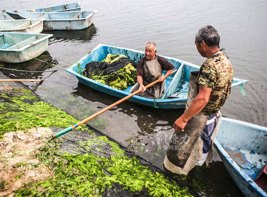 Two workers tidy up seaweeds. (www.iqilu.com/ Feng Xingcai)