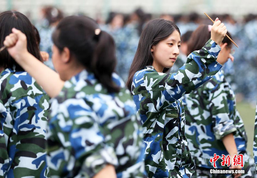 Female freshmen participate in military training in NJAU (Nanjing Agricultural University) on Sept 16, 2014.