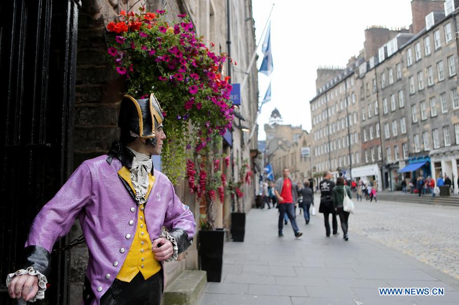 A statue at the gate of a restaurant is seen in Edinburgh, Britain, Sept. 17, 2014. The Scottish Independence Referendum will take place here on September 18, 2014. (Xinhua/Han Yan)