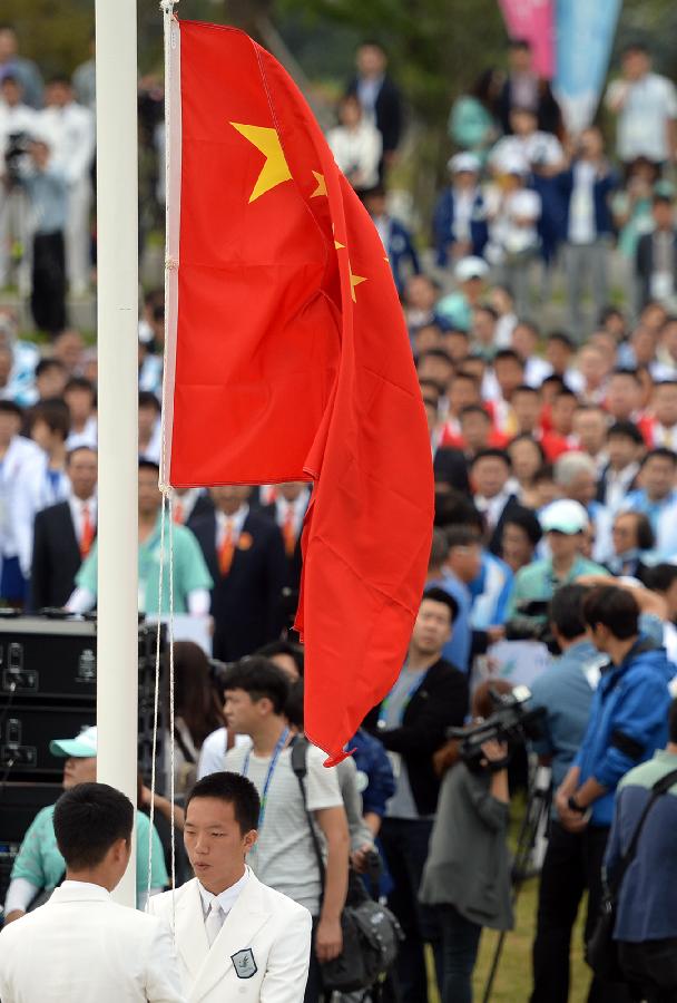 China's national flag is raised during the flag-raising ceremony of the Chinese delegation at the Athletes' Village of the 17th Asian Games in Incheon, South Korea, Sept. 18, 2014. (Xinhua/Han Yuqing)