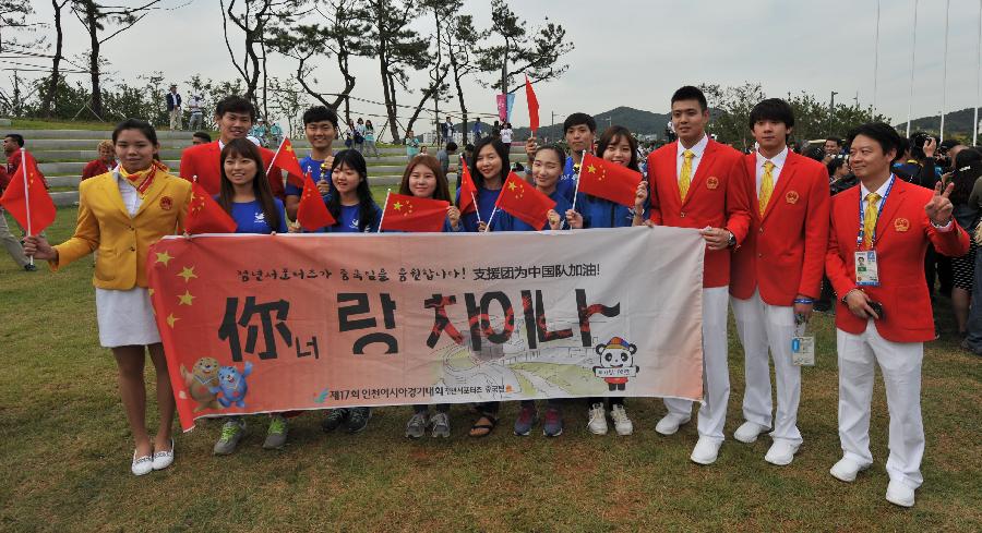 Chinese athletes pose for a group photo with supporters during a flag-raising ceremony at the Athletes' Village in Incheon, South Korea, Sept. 18, 2014. The Chinese delegation to the 17th Asian Games held flag-raising ceremony at the Athletes' Village on Thursday. (Xinhua/Xie Haining)