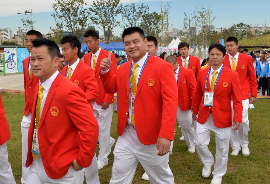 Members of Chinese delegation attend a flag-raising ceremony at the Athletes' Village in Incheon, South Korea, Sept. 18, 2014. The Chinese delegation to the 17th Asian Games held flag-raising ceremony at the Athletes' Village on Thursday. (Xinhua/Zhu Zheng)