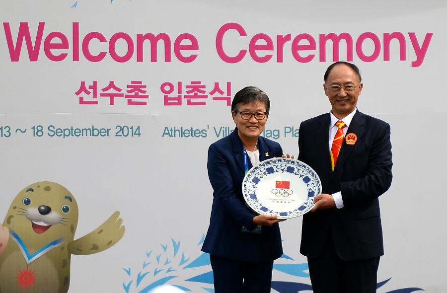 Liu Peng (R), chef de mission of Team China, presents a souvenir to the head of Athletes' Village of the 17th Asian Games during the flag-raising ceremony of the Chinese delegation in Incheon, South Korea, Sept. 18, 2014. (Xinhua/Zhu Zheng)