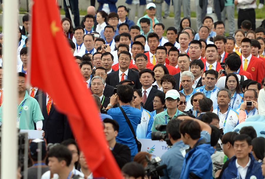 The Chinese delegation to the 17th Asian Games holds flag-raising ceremony at the Athletes' Village in Incheon, South Korea, Sept. 18, 2014. (Xinhua/Han Yuqing)