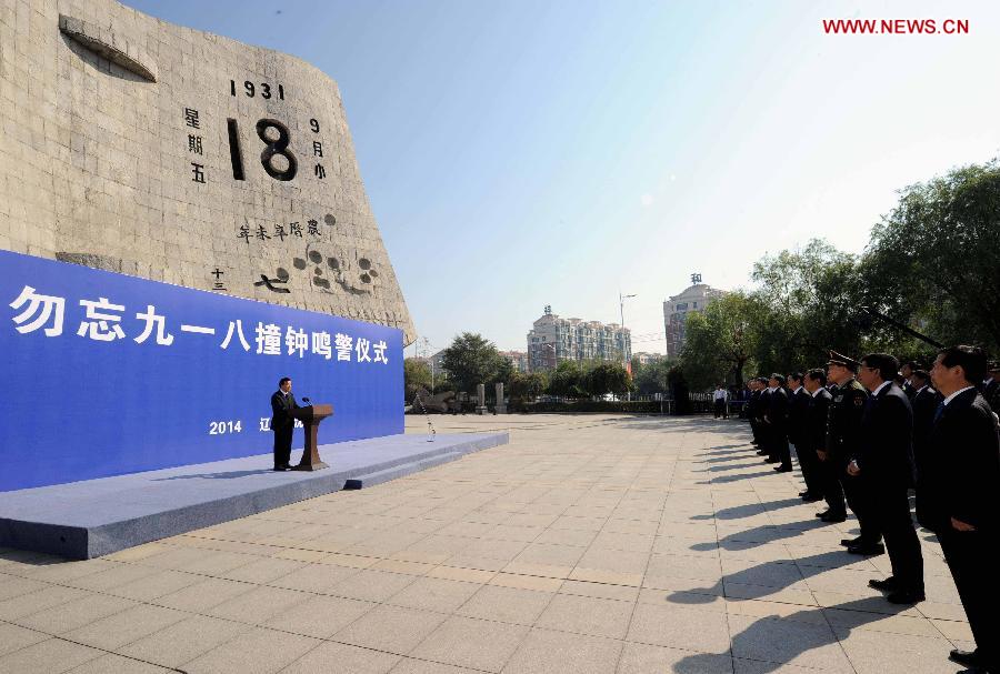 Liu Yunshan, a member of the Standing Committee of the Political Bureau of the Communist Party of China (CPC) Central Committee, addresses a ceremony to mark the 83rd anniversary of the 9.18 Incident, in Shenyang, capital of northeast China's Liaoning Province, Sept. 18, 2014. On Sept. 18, 1931, Japanese troops blew up a section of the railway under their control near Shenyang, and then accused Chinese troops of sabotage as a pretext for attack. They bombarded barracks near Shenyang the same evening, beginning a large-scale armed invasion of northeast China. The incident was followed by Japan's full-scale invasion of China and the rest of Asia, triggering the war against Japanese aggression. (Xinhua/Rao Aimin)