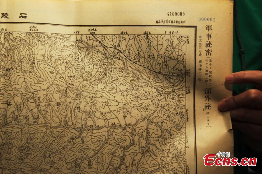 An employee of Administration of Surveying, Mapping and Geoinformation of Central China’s Henan province shows a military map drawn by Japanese army during the Japanese war of aggression against China on Wednesday, September 17, 2014. The detailed topographical map of China is marked with a measuring scale of 1:50,000. The map is exhibited to commemorate the 83rd anniversary of the "9.18 Incident," or "Mukden Incident," which marks the beginning of the 14-year war against Japanese aggression. On September 18, 1931, Japanese troops blew up a section of the railway under their control near Shenyang, and then accused Chinese troops of sabotage as a pretext for attack. They bombarded barracks near Shenyang the same evening, beginning a large-scale armed invasion of northeast China. [Photo: China News Service/ Wang Zhongju]