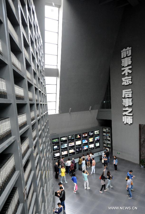 People visit the archives wall at the Memorial Hall of the Victims of the Nanjing Massacre by Japanese Invaders in Nanjing, capital of east China's Jiangsu Province, Sept. 18, 2014, the day marking the 83rd anniversary of the "September 18 Incident". On Sept. 18, 1931, Japanese troops blew up a section of the railway under their control near Shenyang, capital of northeast China's Liaoning Province, and then accused Chinese troops of sabotage as a pretext for attack. They bombarded barracks near Shenyang the same evening, beginning a large-scale armed invasion of northeast China. The incident was followed by Japan's full-scale invasion of China and the rest of Asia, triggering the war against Japanese aggression. (Xinhua/Sun Can)