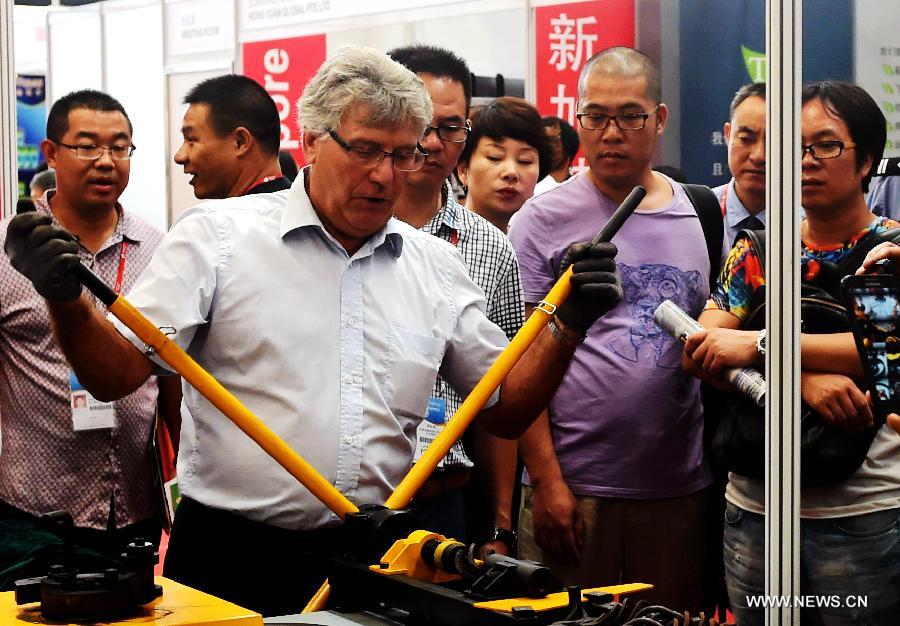 An Austrian engineer demonstrates ironwork making at the 11th China-ASEAN Expo (CAEXPO) in Nanning, capital of south China's Guangxi Zhuang Autonomous Region, Sept. 18, 2014. The annual CAEXPO attracted worldwide visitors and businessmen who searched for markets and business opportunities. (Xinhua/Zhang Ailin)
