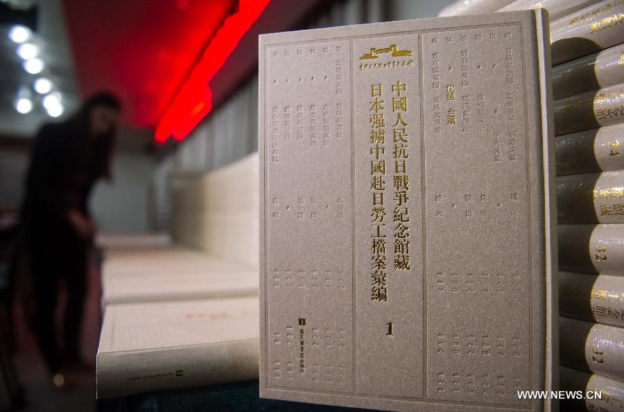 Photo taken on Sept. 18, 2014 shows the cover of the newly-issued archives compilation of Chinese laborers captured and taken by Japanese invaders to Japan at the Museum of the War of the Chinese People's Resistance Against Japanese Aggression, in Beijing, China. From 1943 to 1945, some 40,000 Chinese were captured and taken by the invaders to Japan, forcing them to work in mines and construction sites. A total of 6,830 died due to the ruthless exploitation, according to the data from Japan. (Xinhua/Luo Xiaoguang)