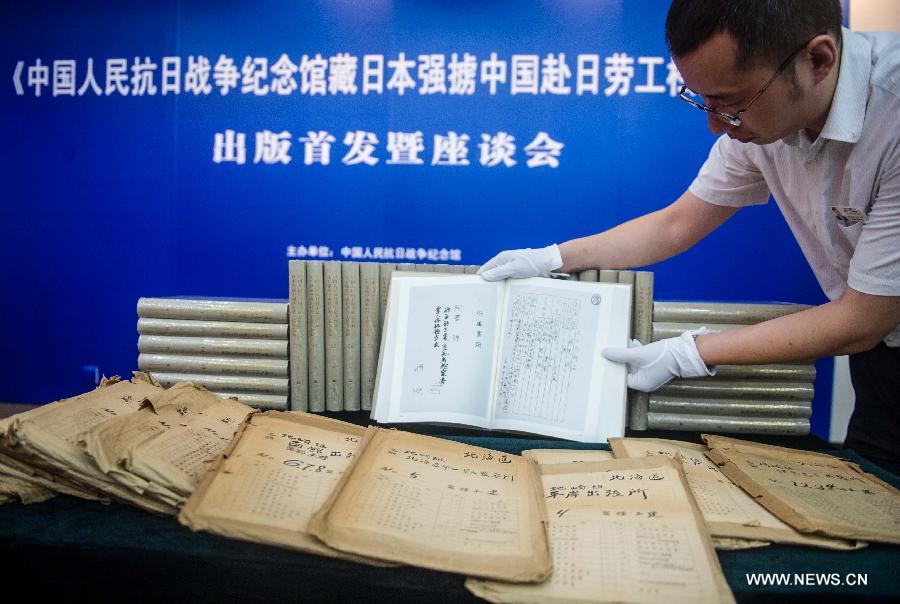 | A staff members shows the content of the newly-issued archives compilation of Chinese laborers forced to Japan at the Museum of the War of the Chinese People's Resistance Against Japanese Aggression, in Beijing, China, Sept. 18, 2014. From 1943 to 1945, some 40,000 Chinese were captured and taken by the invaders to Japan, forcing them to work in mines and construction sites. A total of 6,830 died due to the ruthless exploitation, according to the data from Japan. (Xinhua/Luo Xiaoguang) |