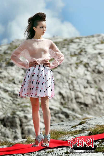 Super models from a Chinese reality show wearing 12cm high heels walk on the 50-meter red carpet on Dolomiti Di Brenta, the Alps in Italy on Sept. 10, 2014. (CNS/GXTV)